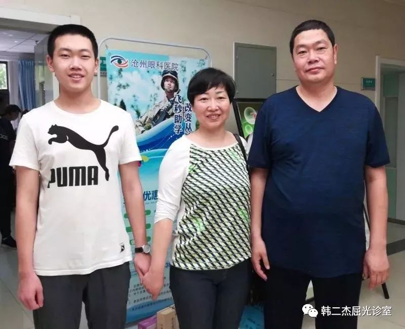2018年6月13日下午,河北河间市宛先生一家三口在沧州眼科医院,韩二杰主任成功为三人进行了“飞秒激光近视手术”,次日复查时视力均恢复至正常。其心大悦!颂诗为记——